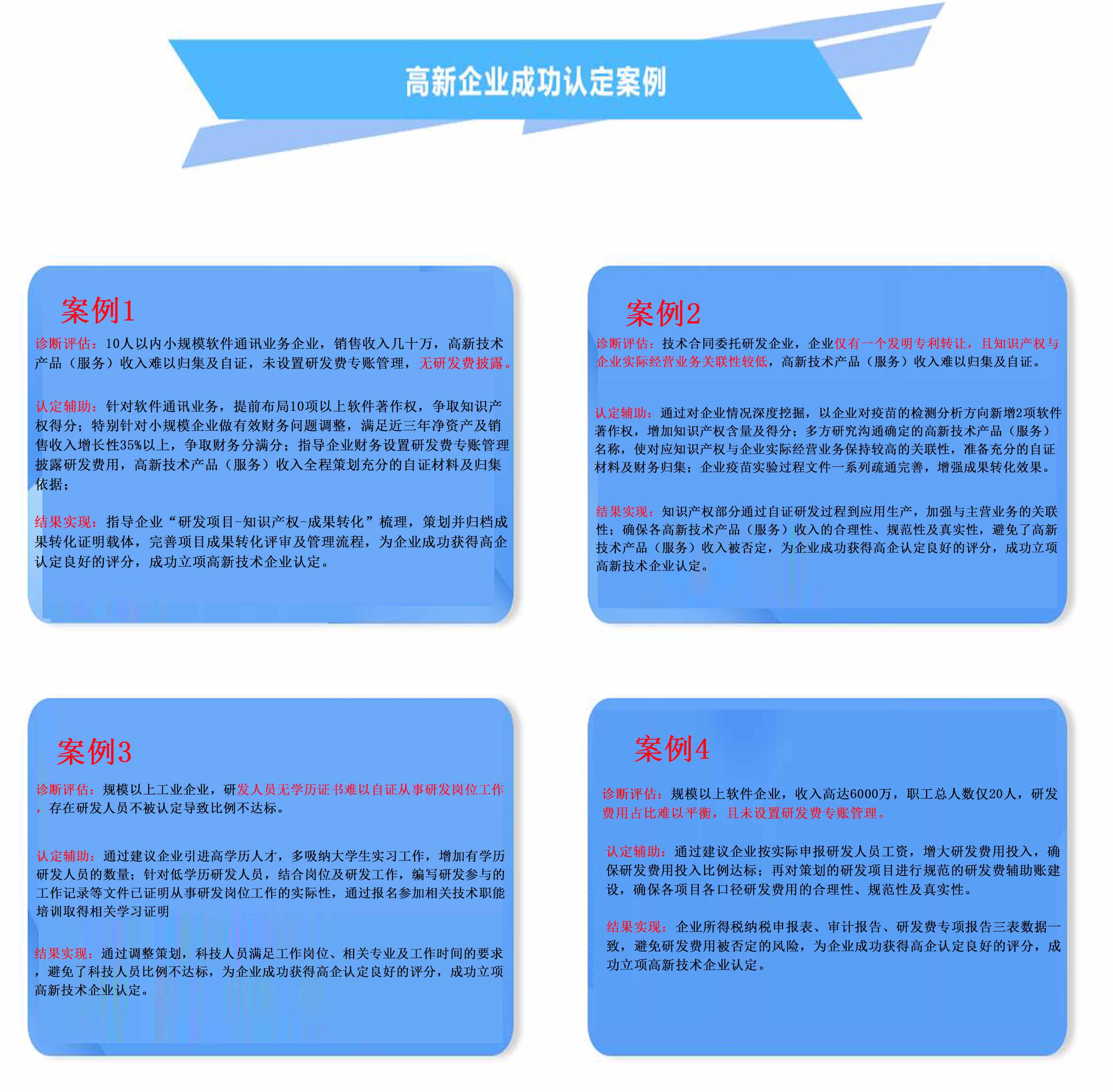 認定輔助:針對軟件通訊業務,提前布局10項以上軟件著作權,爭取知識產權得分;特別針對小規模企業做有效財務問題調整,滿足近三年凈資產及銷售收入增長性35%以上,爭取財務分滿分;指導企業財務設置研發費專賬管理披露研發費用,高新技術產品(服務)收入全程策劃充分的自證材料及歸集依據;
