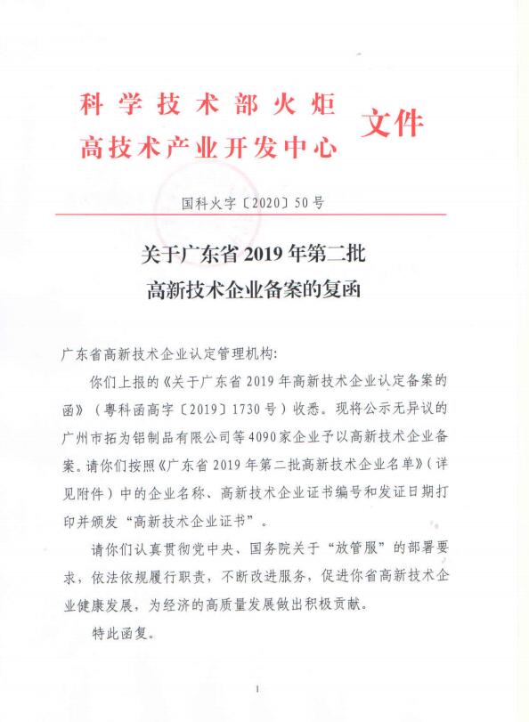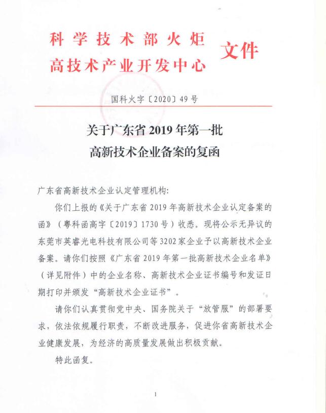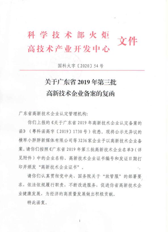 經全國高新技術企業認定管理工作領導小組辦公室備案批復同意,廣東省三批次合計10528家企業被認定為廣東省2019年高新技術企業,相較于擬公示名單共有183家企業未通過備案獲得高新技術企業證書編號!